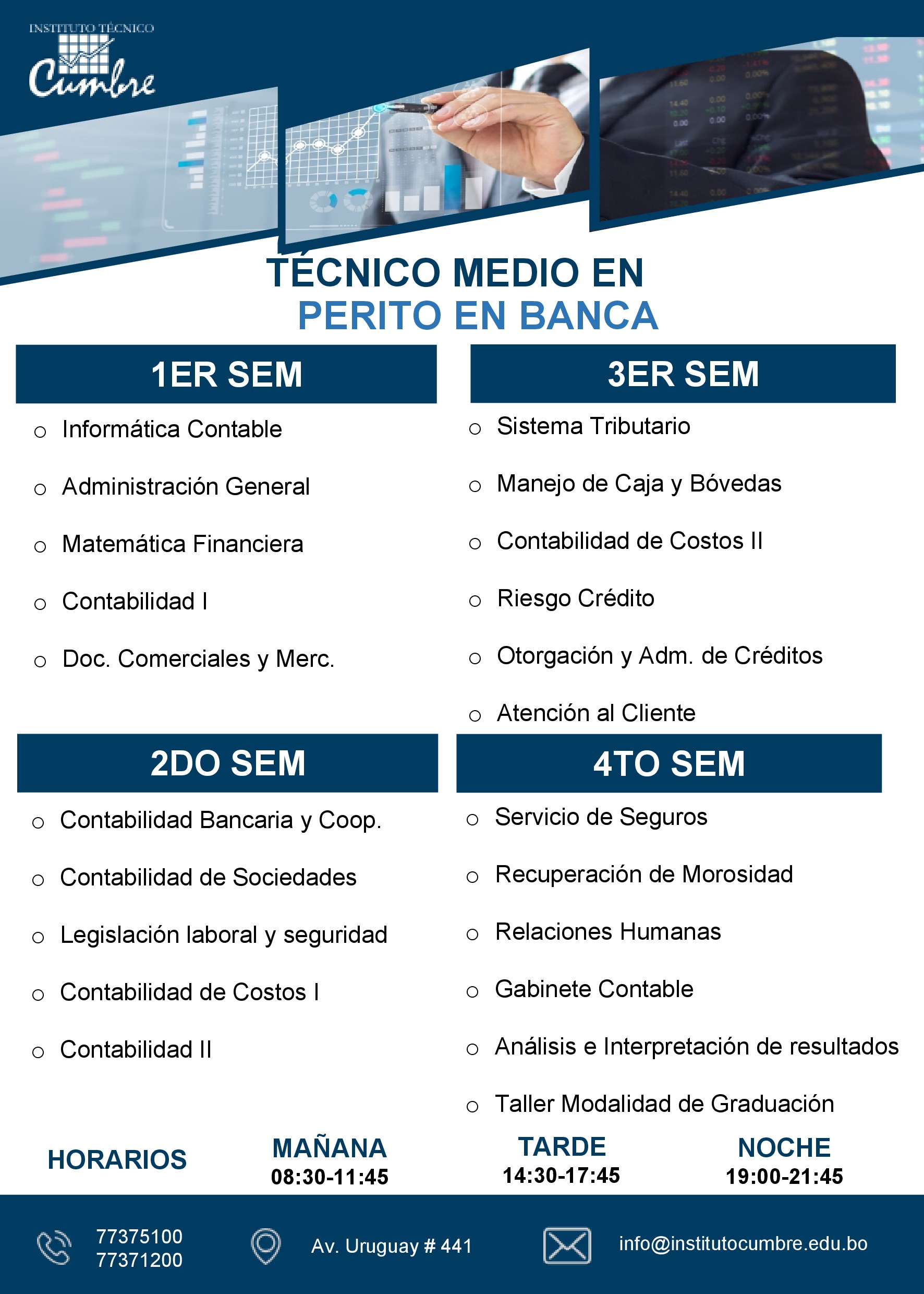 El profesional en Perito en Banca es un visionario capaz de desenvolverse en áreas administrativas especializadas en Banca, Finanzas, Producción y Consultoría. Sus actividades se centran en la planeación, organización y revisión y auditoria de las organizaciones a través del análisis financiero, operativo y de mercado. Además, el perito en banca coordina y aplica normas contables, tributarias y procedimientos administrativos bancarios.